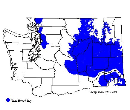 Mostly an eastern Washington species, the American Tree Sparrow is found in Washington only during the winter. It is locally uncommon in eastern Washington from October to March, with some birds lingering into early April. In western Washington, it is locally uncommon to rare in scattered areas, including Bellingham (Whatcom County), Camano Island (Island County), Snoqualmie and Snohomish River valleys, Skagit River delta, and Monroe (Snohomish County). Look for it in deciduous trees and brush along edges and watercourses in relatively open habitat.