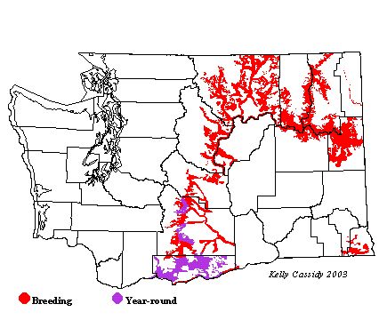 Lewis's Woodpeckers breed in eastern Washington, where they are locally common at the transition zone between Ponderosa pine and shrub-steppe habitats. They are also uncommon breeders in northeastern Washington in Pend Oreille, Stevens, and Lincoln Counties. They were formerly common in far-eastern Washington, but numbers in Spokane County have declined dramatically, and populations appear to be extirpated in Walla Walla and Columbia Counties, although there may still be a lingering breeding colony in the Blue Mountains. They can sometimes be found as rare migrants in western Washington. Winter populations can also often be found at Fort Simco and Upper Cowiche Creek (Yakima County), and Klickitat County.