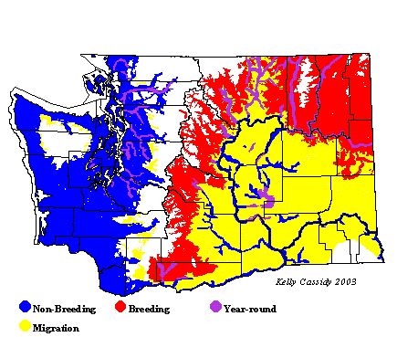 Fall migration starts in September and lasts until early December, with the majority of movement in October and November. Breeding birds from east of the Cascades move through the Great Plains to winter in the highlands of Arizona, New Mexico, and northern Mexico. Western Washington breeders winter along the Pacific coast from British Columbia to northern Central America with the greatest concentration in California's Central Valley. Males tend to winter farther north than females. Spring migration lasts from early February through March.