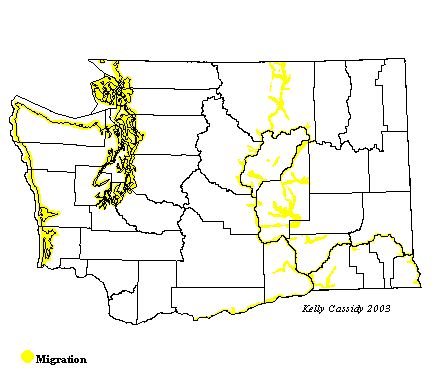 The closest Common Tern breeding colonies are in Alberta and central Montana. In Washington, this tern is a common migrant in coastal areas in saltwater and sandy-shore habitats in May through early June, and then again from August through October. It is uncommon in freshwater habitats. In eastern Washington, it is a rare spring migrant and fairly common in small numbers in fall.