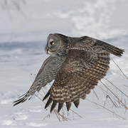Great Gray Owls hunt by day as well as night, especially during the summer when they are raising chicks. They typically use a sit-and-wait hunting style, watching from a perch and swooping down silently on unsuspecting prey. Sometimes they fly low over open areas, scanning for prey. They can locate prey by sound alone and will break through crusted snow to get at rodents tunneling more than a foot beneath the surface. Sometimes Great Gray Owls form loose groups in winter where there is a concentration of prey.