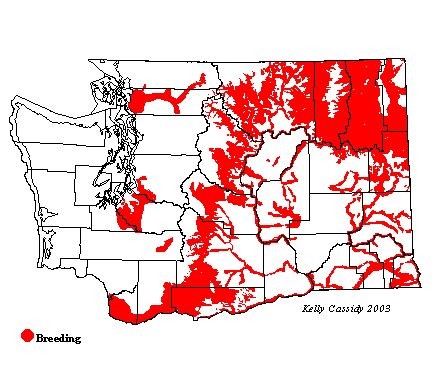 Lazuli Buntings are common in eastern Washington in the ponderosa pine zone and along major rivers, from mid-May through September. They are local and uncommon at higher elevations east and west of the Cascade crest. The Lazuli Bunting is mostly an eastern Washington bird, but can be found locally west of the Cascades at Fort Lewis (Pierce County), in the Vancouver area (Clark County), along the Skagit and Cowlitz Rivers, and in south King County on the Muckleshoot Prairies around Enumclaw.