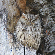 Western Screech-Owls are small owls with yellow eyes, dark bills, and ear-tufts that are often but not always raised. They have intricately streaked gray or gray-brown plumage, with owls of the eastern Washington subspecies lighter in color than those of the western. Flammulated Owls are smaller but similar in coloration; they can best be distinguished from Western Screech-Owls by their dark eyes.